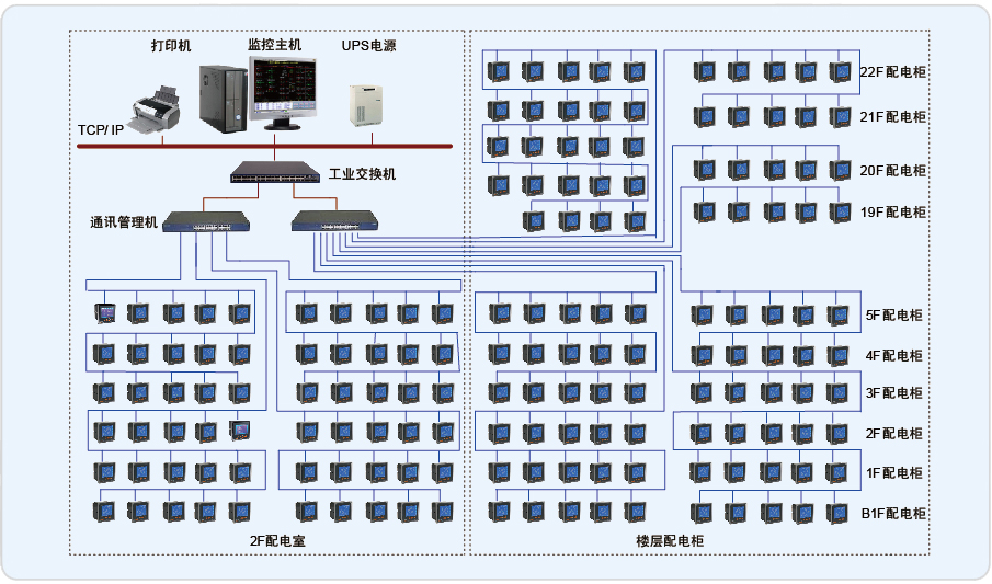 上海百樂(lè )門(mén)大酒店電力監控系統監控范圍為百樂(lè )門(mén)大酒店的22個(gè)樓層的PZ系列電力儀表和配電室的PZ、ACR系列電力儀表進(jìn)行遠程監測?,F場(chǎng)設備全集中在同一個(gè)配電室中,業(yè)主的電氣值班室就近安排在配電室旁,本系統監控中心也安置在該值班室中。系統組網(wǎng)采用常見(jiàn)的3層結構,站控管理層、通訊管理層和現場(chǎng)設備層。